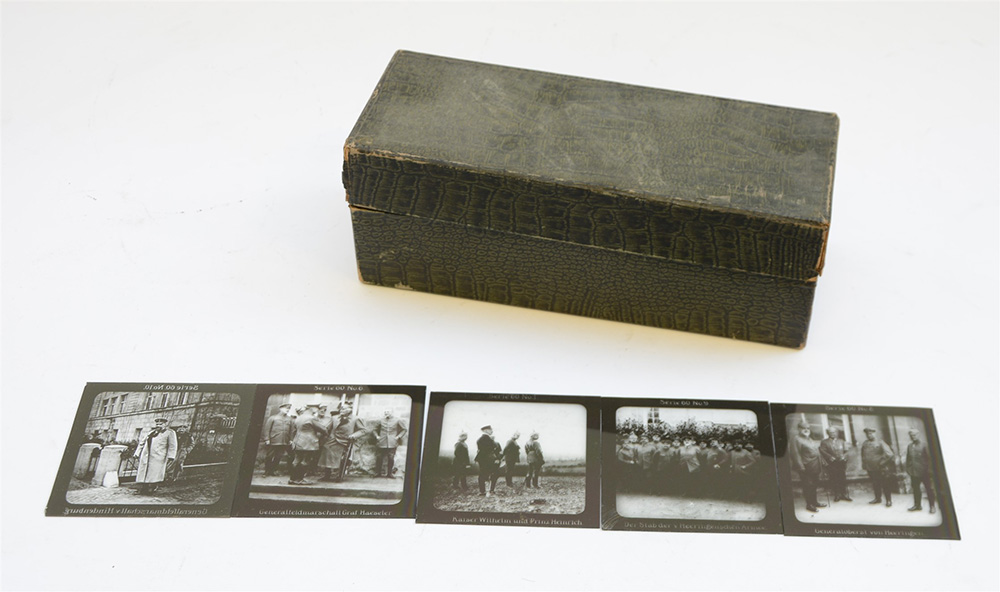 Lotto composto da tre scatoloni contenenti numurosi raccoglitori con diapositive in bianco e nero montate su vetro realizzate per le Projektion Fur Alle inerenti a fatti militari e non, con descrizione in tedesco. Inzio del sec. XX (difetti e mancanze)