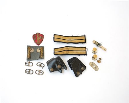 Lotto composto da coppia di ricami di gradi per manica, un ricamo con fili metallici di due fasci littori, scudetto con fascio e tre stelle e due “M” mussoliniane in pelle, due bottoni di ferma spalline contenute in dell'epoca della Ditta Cesati, Milano (difetti)