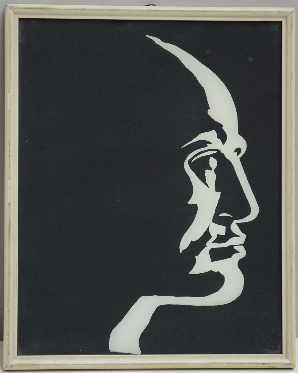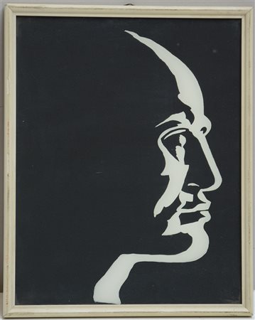 Dipinto in bianco e nero su carta raffigurante il profilo del Duce, in cornice laccata nera (cm 31,5x26) (difetti)