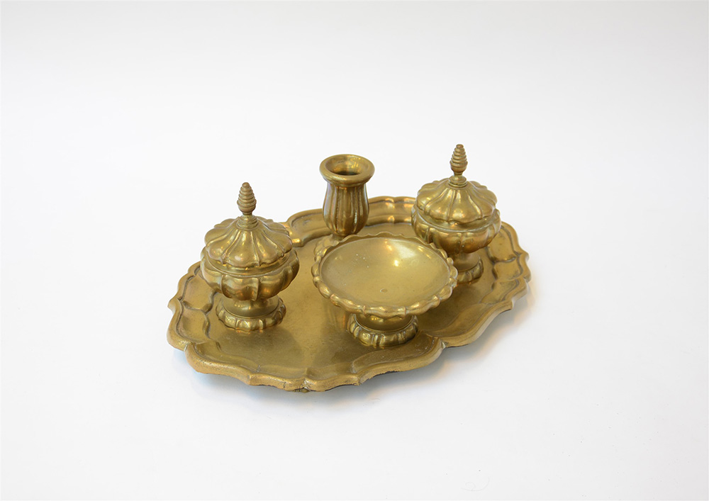 Servizio da tavolo in bronzo composto da vassoio, tre contenitori ed un'alzatina