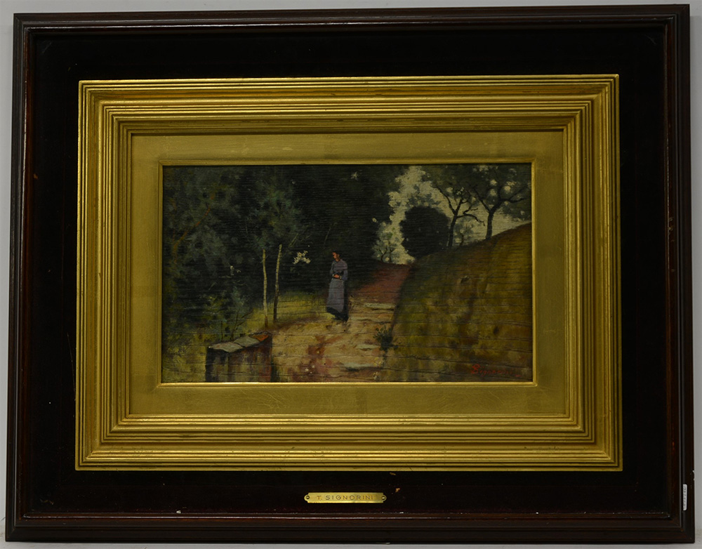 Falso d'autore. Da Telemaco Signorini "Sulla strada" olio su tavoletta (cm 20x33) In cornice
