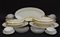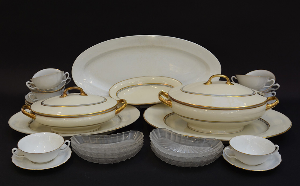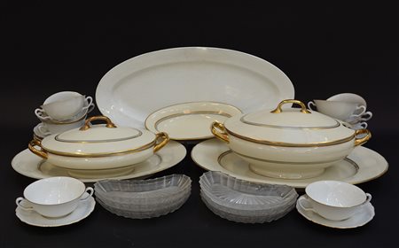 Manifatture diverse. Lotto composto da due zuppiere, quattro piatti ovali, otto tazze con piattini in porcellana bianca uniti a sei antipastiere in vetro (difetti)
