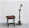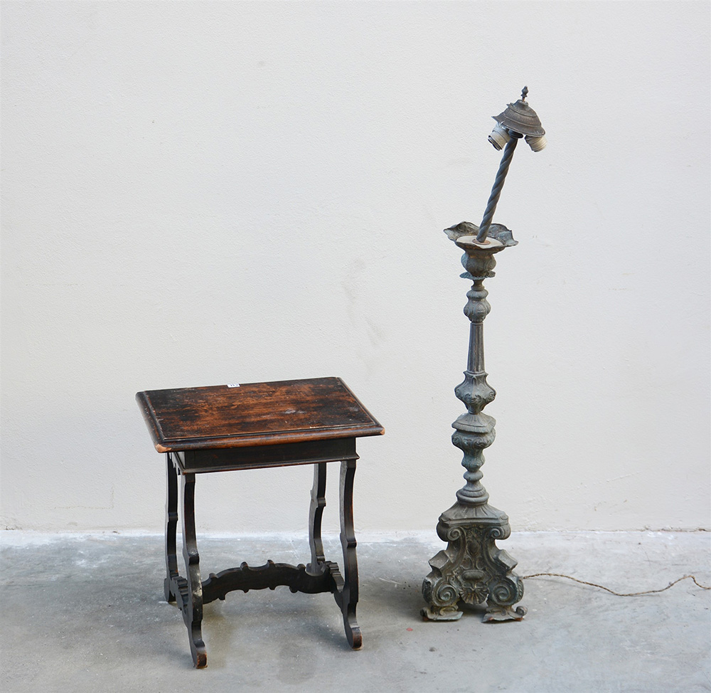 Lotto composto da un candelieri in metallo e un piccolo tavolino rettangolare (difetti)