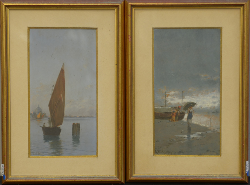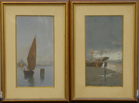 Delgrossi "Marine con barche e figure" Due piccoli olii su tavoletta firmati, In cornici