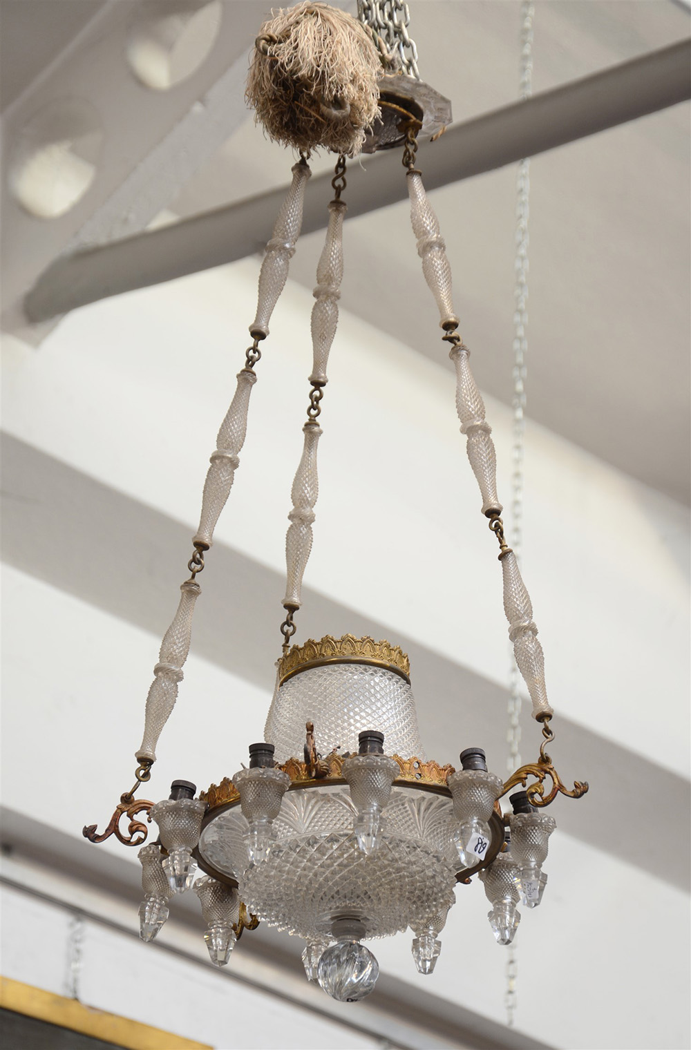 Lampadario in cristallo molato e ottone con catene e pinnacoli torniti (gravi difetti)