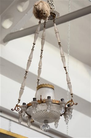 Lampadario in cristallo molato e ottone con catene e pinnacoli torniti (gravi...