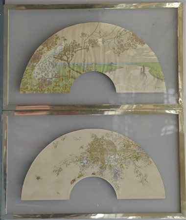 Ludovico Cavaleri (1867 - 1942) Due progetti dipinti su pergamena per pagine di ventaglio, firmate e datate Milano 1902, in cornici (difetti)