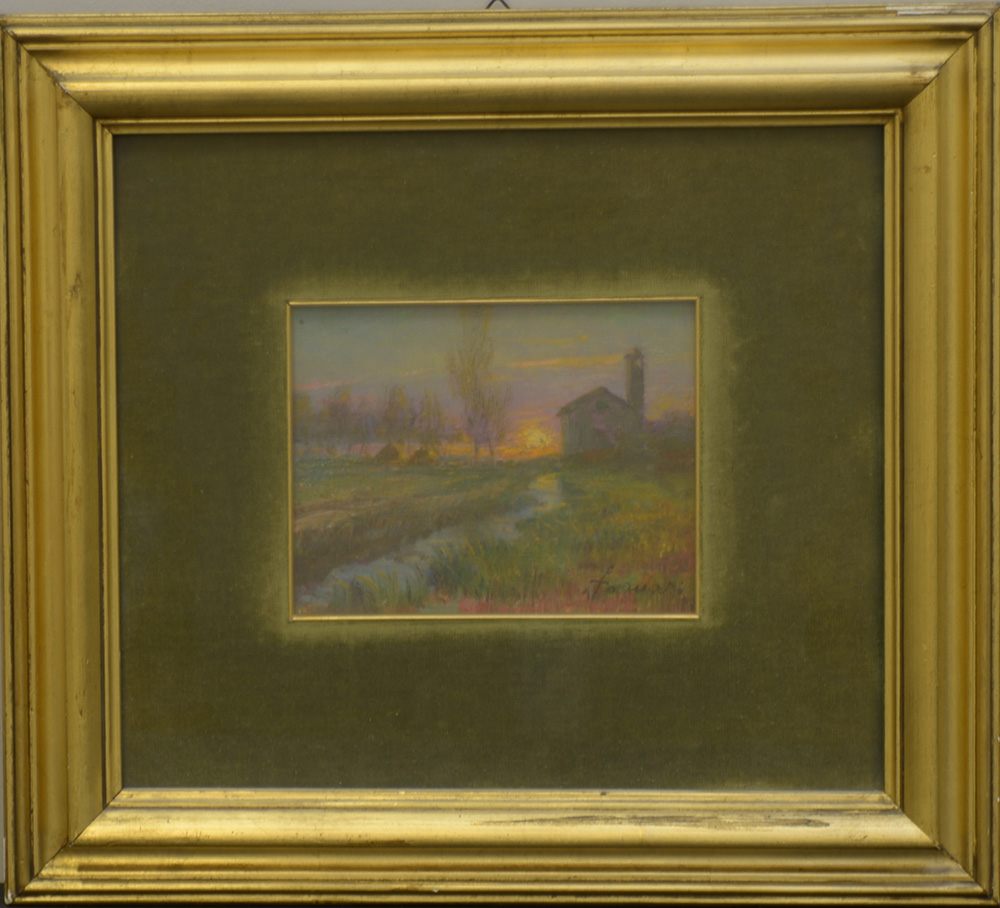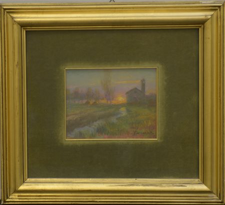 Fornari "Paesaggio al tramonto" Olio su tavoletta (cm 13x16) firmato in basso a destra, in cornice