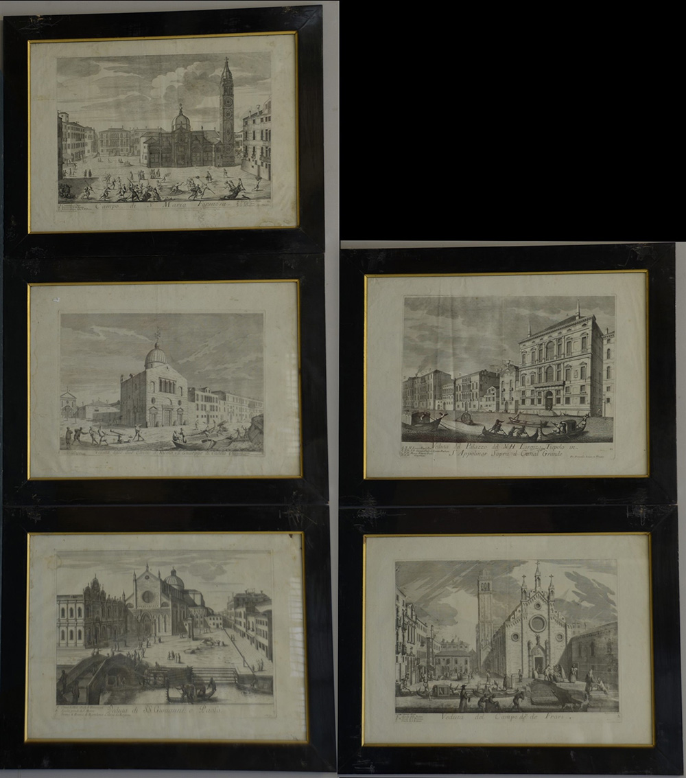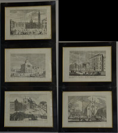 Gruppo di cinque acqueforti monocrome raffiguranti chiese e palazzi veneziani (cm 44x61) In cornici ebanizzate del sec. XIX (difetti)