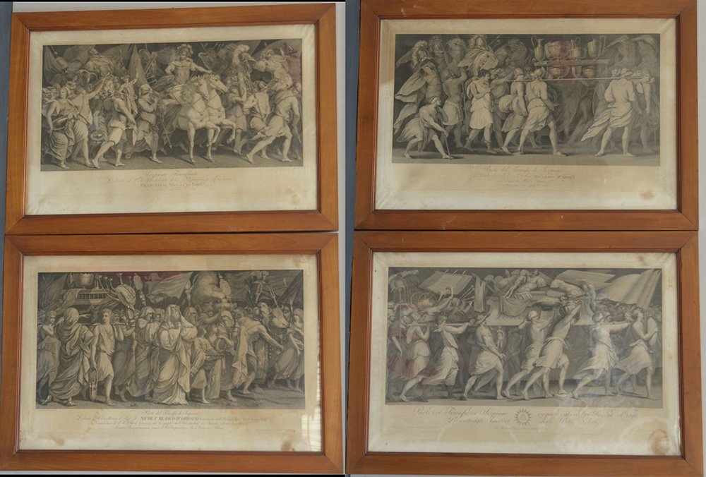 Gruppo di quattro stampe monocrome di incisori diversi, raffiguranti parti del trionfo di Scipione (cm 48x73) Sec. XIX, in cornici di noce (difetti)