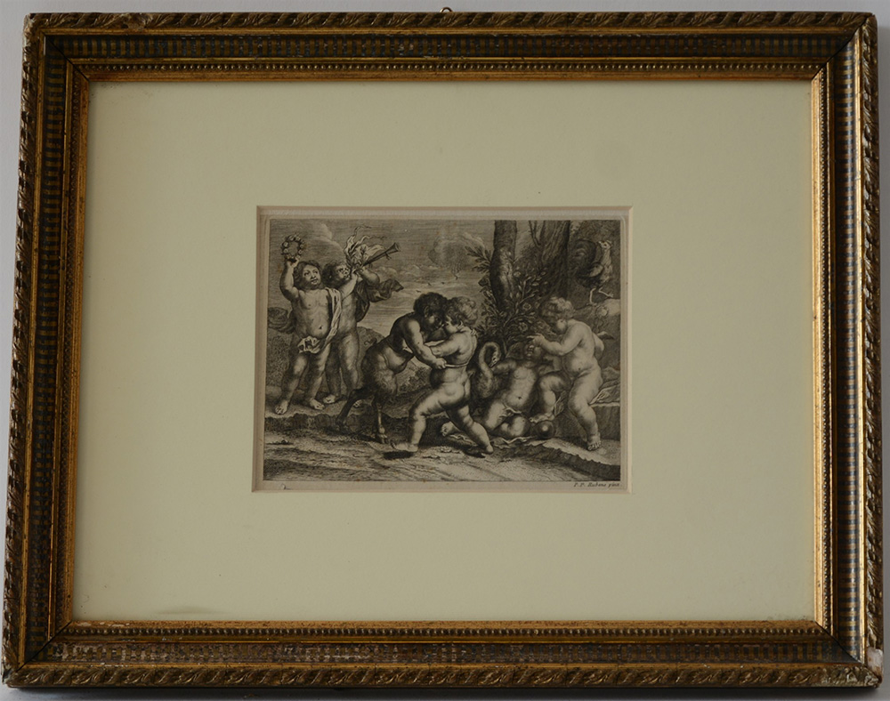 Antica incisione raffigurante putti in un paesaggio, in cornice