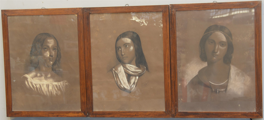 Ernesta Vicentini "Ritratti di giovani donne" tre disegni a matita e biacca su carta (cm 58x44) firmati e datati 1860. In cornici di noce coeve (difetti)