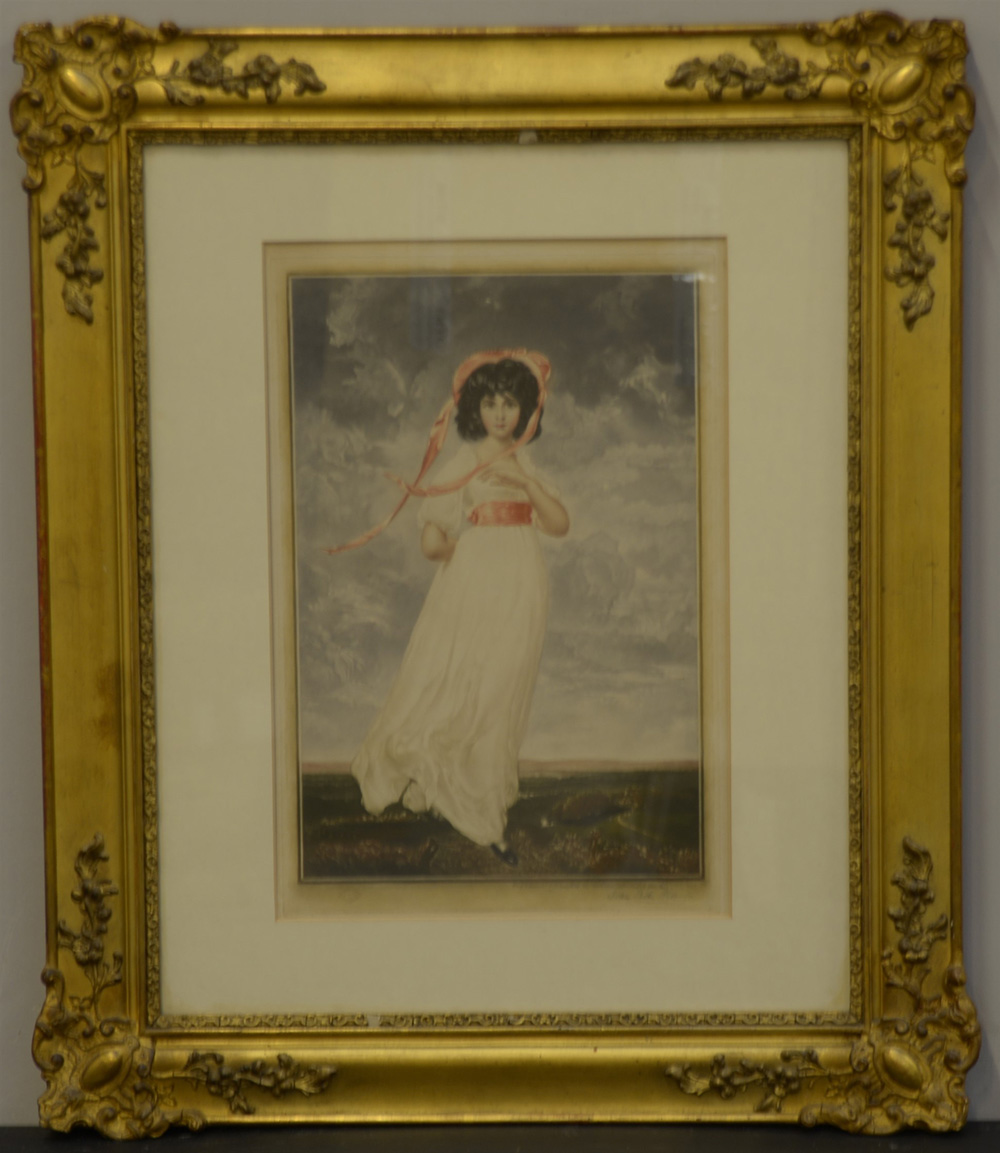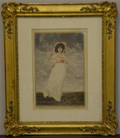 John Cother (Attr.) litografia a colori del sec. XIX raffigurante una fanciulla con cappello e fascia rosa (cm 41x28) in cornice di legno e pastiglia dorata coeva (difetti)