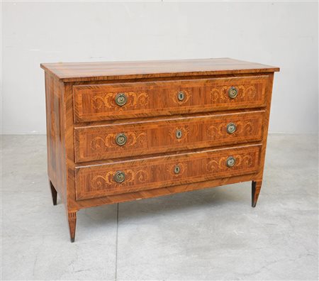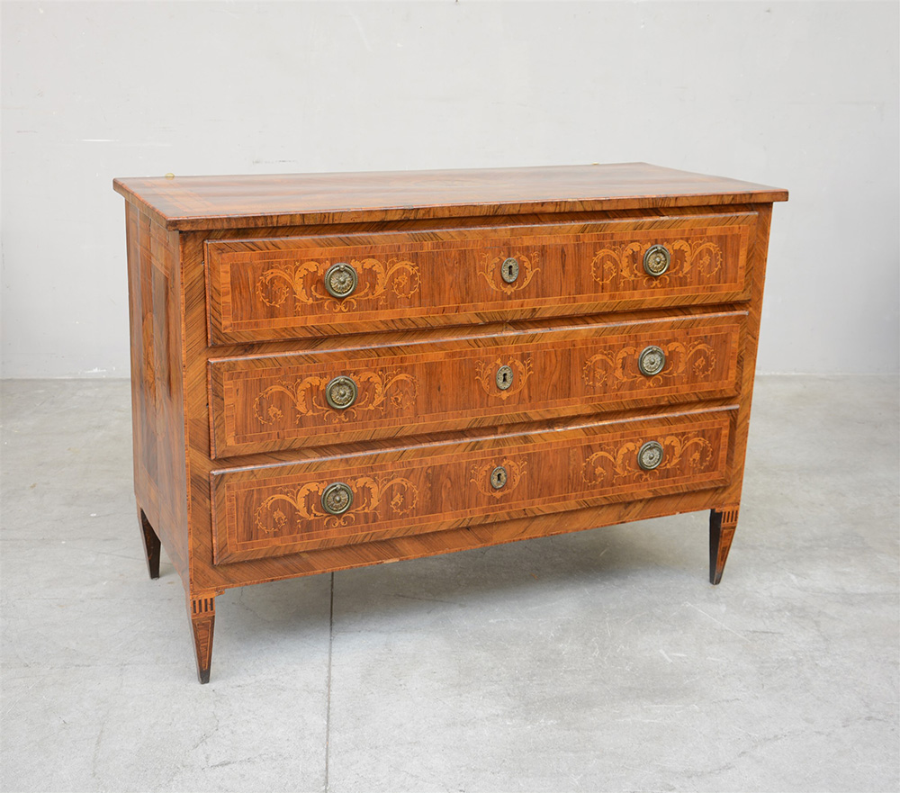 Antico comò in noce a tre cassetti lastronato e filettato decorato con intarsi a rosoni e rami fogliati. Quattro gambe rastremate (cm 137x96x59) (difetti)