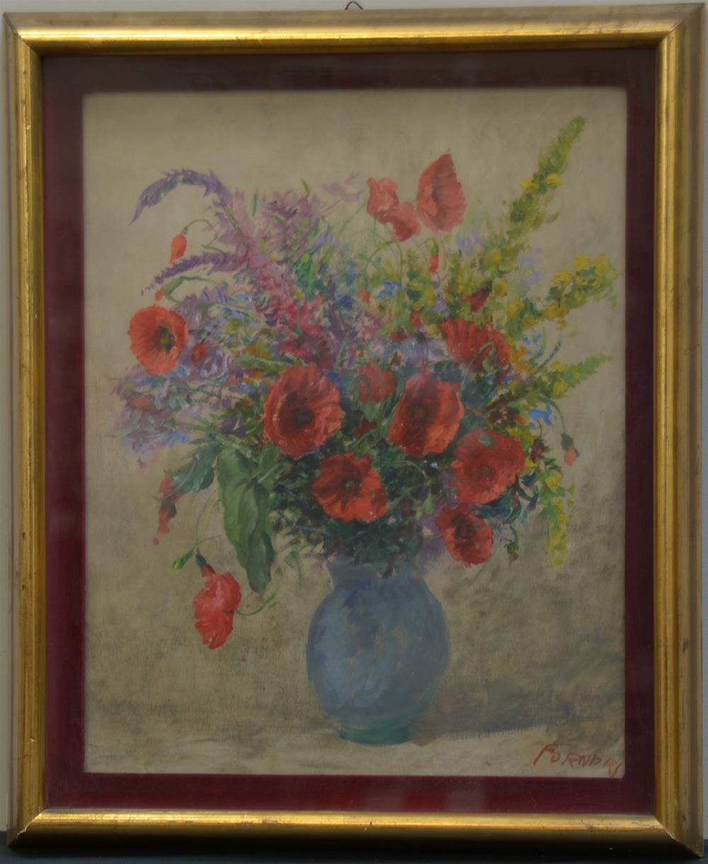 Fornari "Vaso con fiori rossi" Olio su compensato (cm 50x40) firmato in basso a destra. In cornice