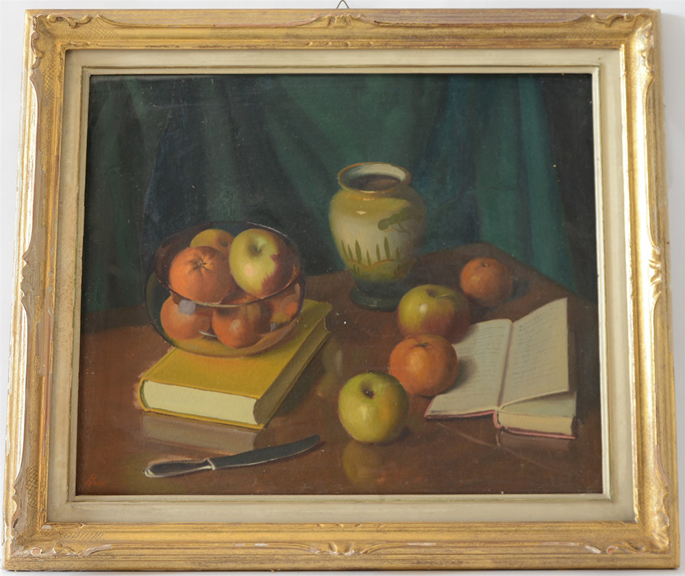Firma indecifrata "Natura morta con frutta e libro" olio su masonite (cm 50x60) firmato in basso a sinistra, in cornice