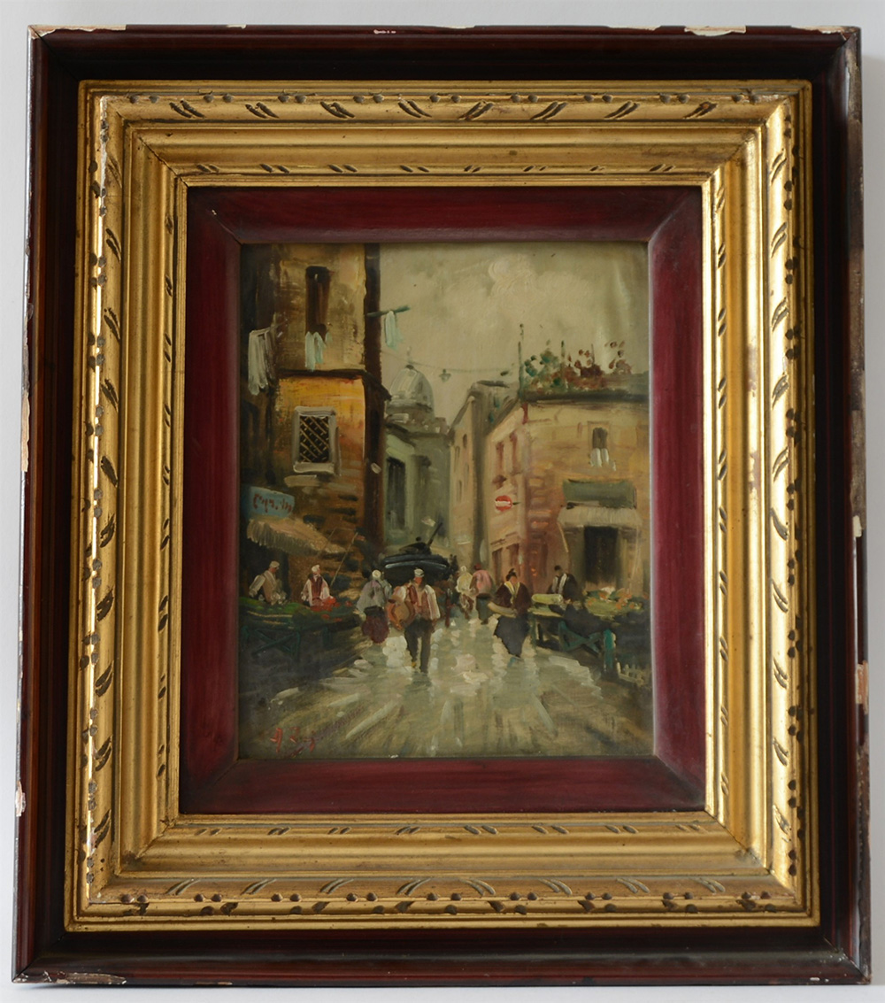 Ignoto "Scena di mercato" olio su cartone telato (cm 30x22) Siglato in basso a sinistra, in cornice