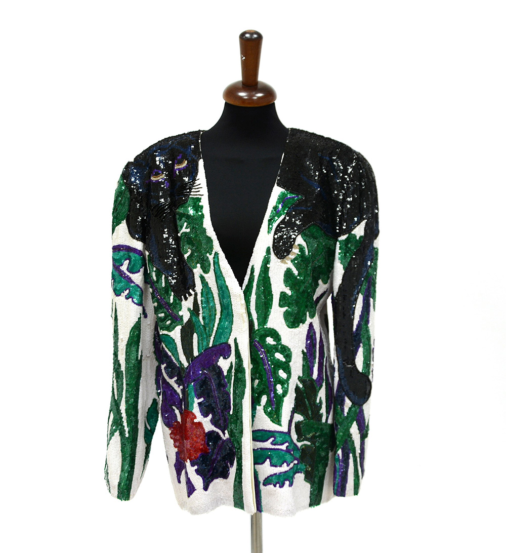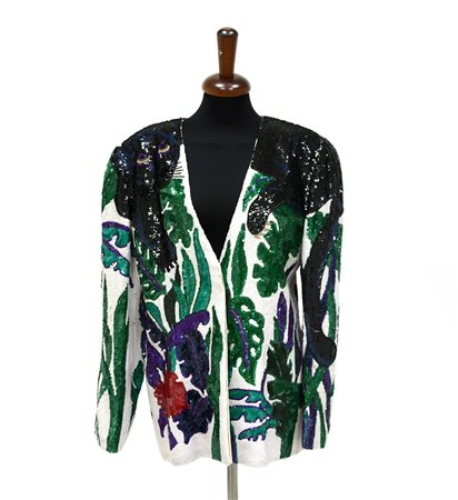 KRIZIA Giacca in tessuto ricamato a paillettes nei toni del bianco, nero, verde, blu, viola e rosso, con la sua classica pantera (tg 46) (difetti) -EN KRIZIA A jacket embroidered in sequins in white, black, green, blue, violet and red with the classic panther (size 46) (defects)