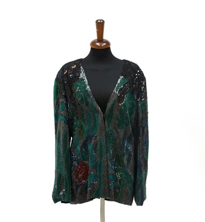 KRIZIA Giacca in tessuto ricamato con paillettes, canottiglie e perline a riprodurre il suo classico disegno con pantera, sui toni del nero, verde bosco, blu e rosso (tg 44) -EN KRIZIA A jacket embroidered with sequins, bugle beads and beads to form a panther in black, green, blue and red (size 44)