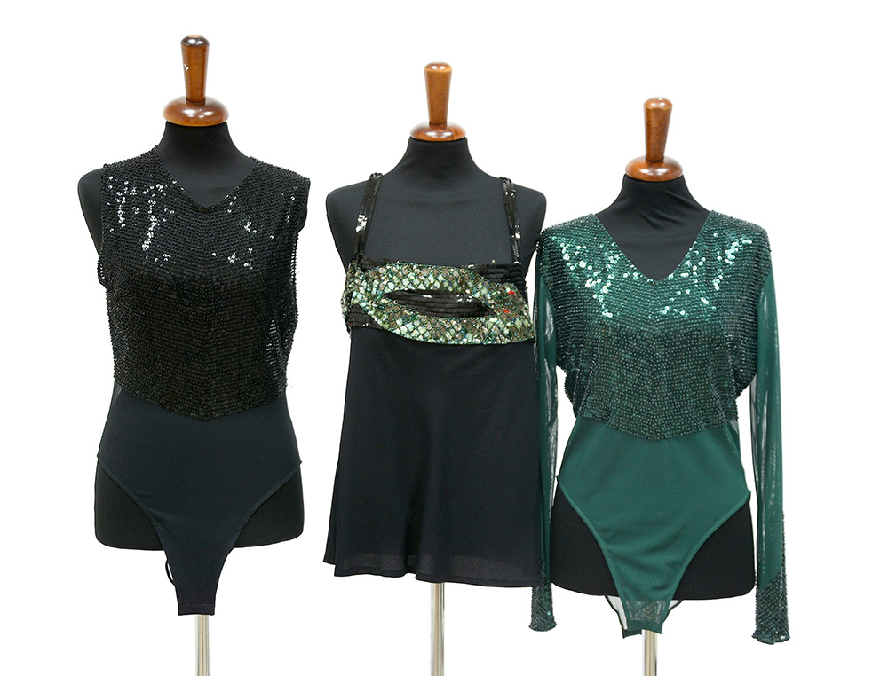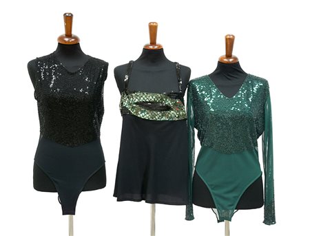 KRIZIA Lotto composto da un top e due body di cui uno a maniche lunghe sui toni del nero e del verde muschio, tutti rifiniti con paillettes, tessuti, fogge e taglie differenti -EN KRIZIA Lot comprising a top, a long sleeved black body and a short sleeved musk green body, all with sequined details (different sizes)