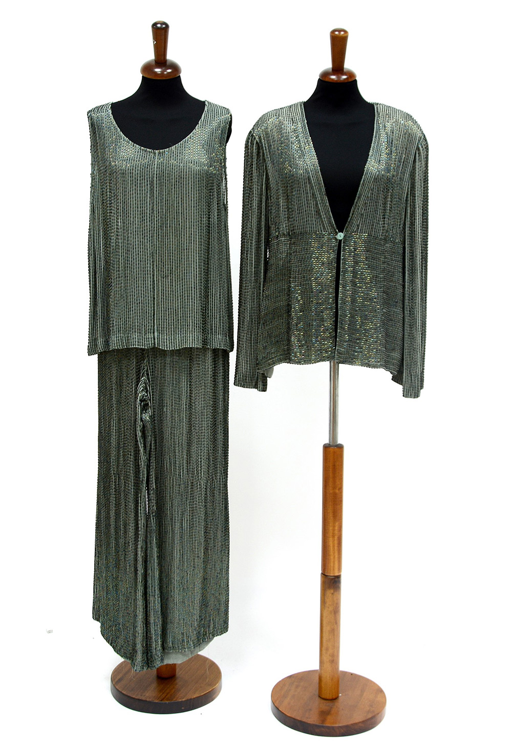 KRIZIA Completo color salvia rifinito con canottiglie composto da un capospalla, una canottiera e un pantalone (difetti) -EN KRIZIA Sage suit embroidered with bugle beadscomprising a jacket, a singlet and slacks (defects)