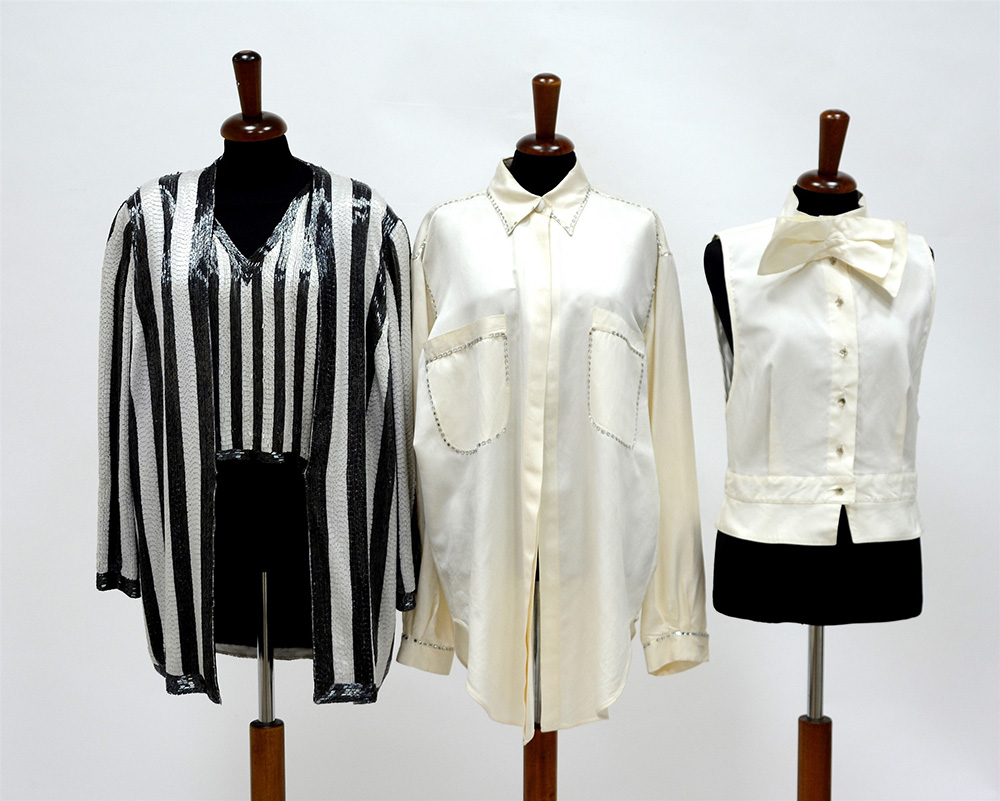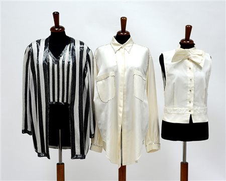 KRIZIA Lotto composto da un capospalla e un top ricamato con canottiglie a formare righe bianche e nere, uniti ad una camicia e un top in misto cotone color bianco, la camicia rifinita in strass (taglie varie) (difetti e mancanze) -EN KRIZIA Lot comprising an oversize jacket and top embroidered with bugle beads and a white shirt and top in cotton blend (various sizes) (defects and losses)