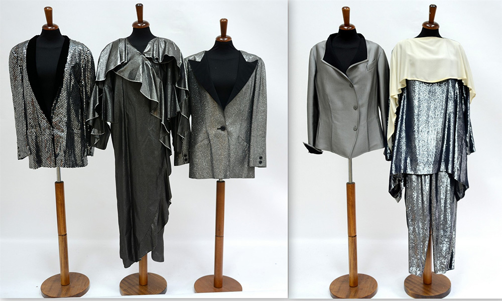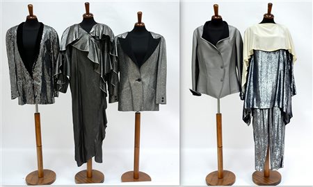 KRIZIA Lotto di tre capispalla, un abito lungo e un completo in vari tessuti sui toni dell'argento, fogge e taglie differenti (difetti) -EN KRIZIA Lot comprising three coats, a long dress and a suit of different styles and sizes in various silvered fabrics (defects)