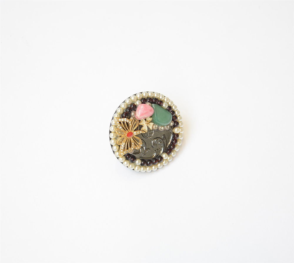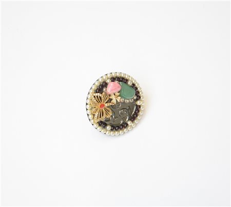 PAOLO BELLINI Importante anello di forma circolare in metallo brunito decorato con paste vitree, perle fancy, strass e farfalla