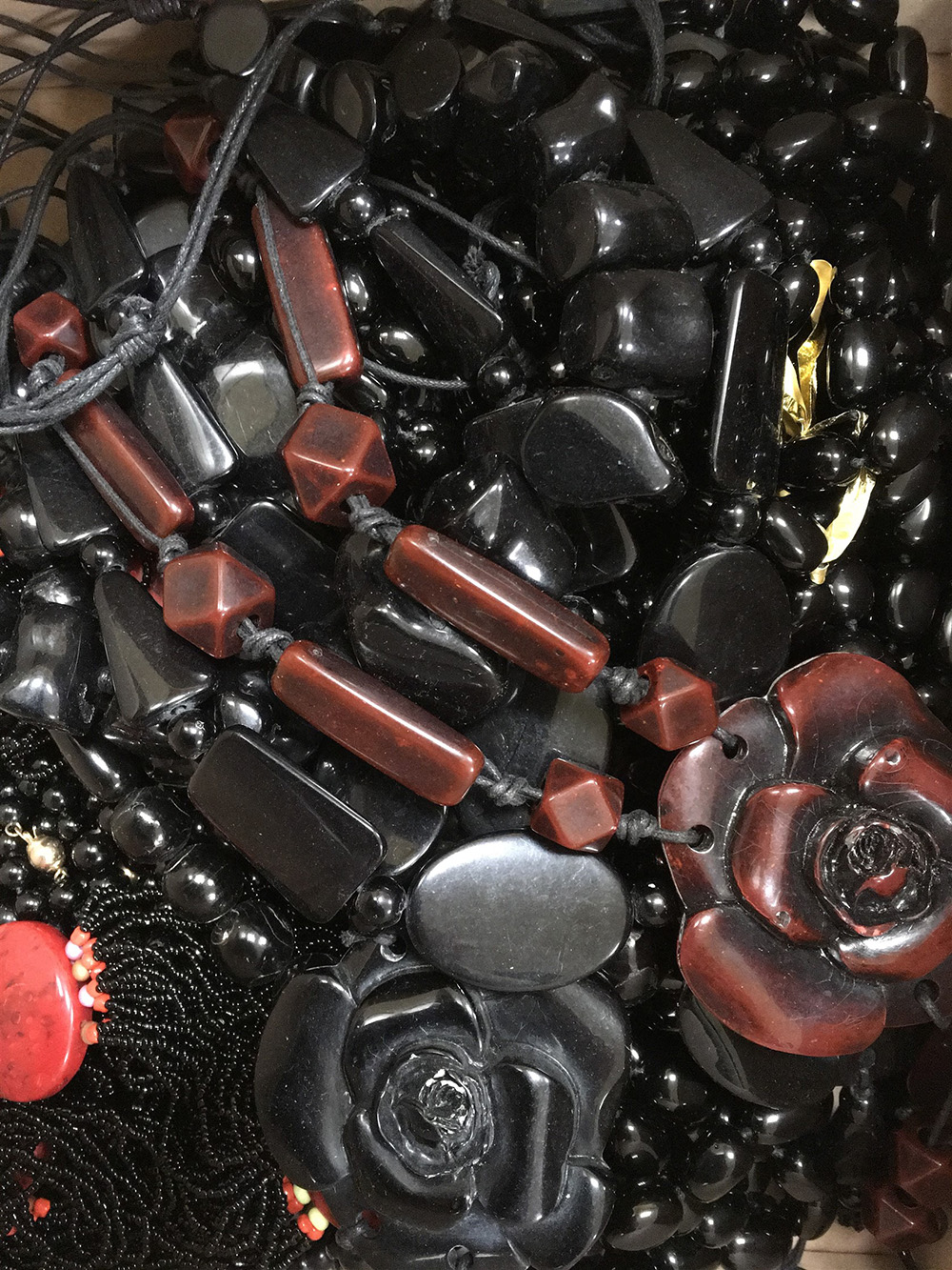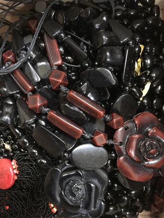 Lotto in scatolone di bigiotteria, sopratutto collane di grandi dimensioni in materiali cari, quasi tutte sui toni del nero (difetti)