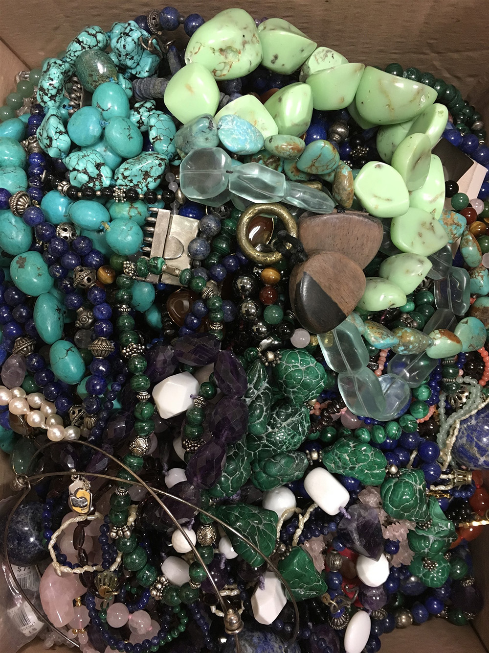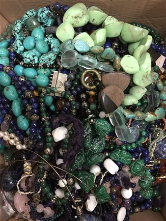Lotto in scatolone di bigiotteria di pietre dure, maggioranza di collane, ma anche pietre sciolte (difetti)