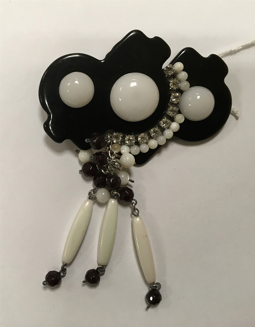PAOLO BELLINI Spilla in galalite nera e bianco latte decorata con strass e piccole boules bordeaux (lievi difetti)