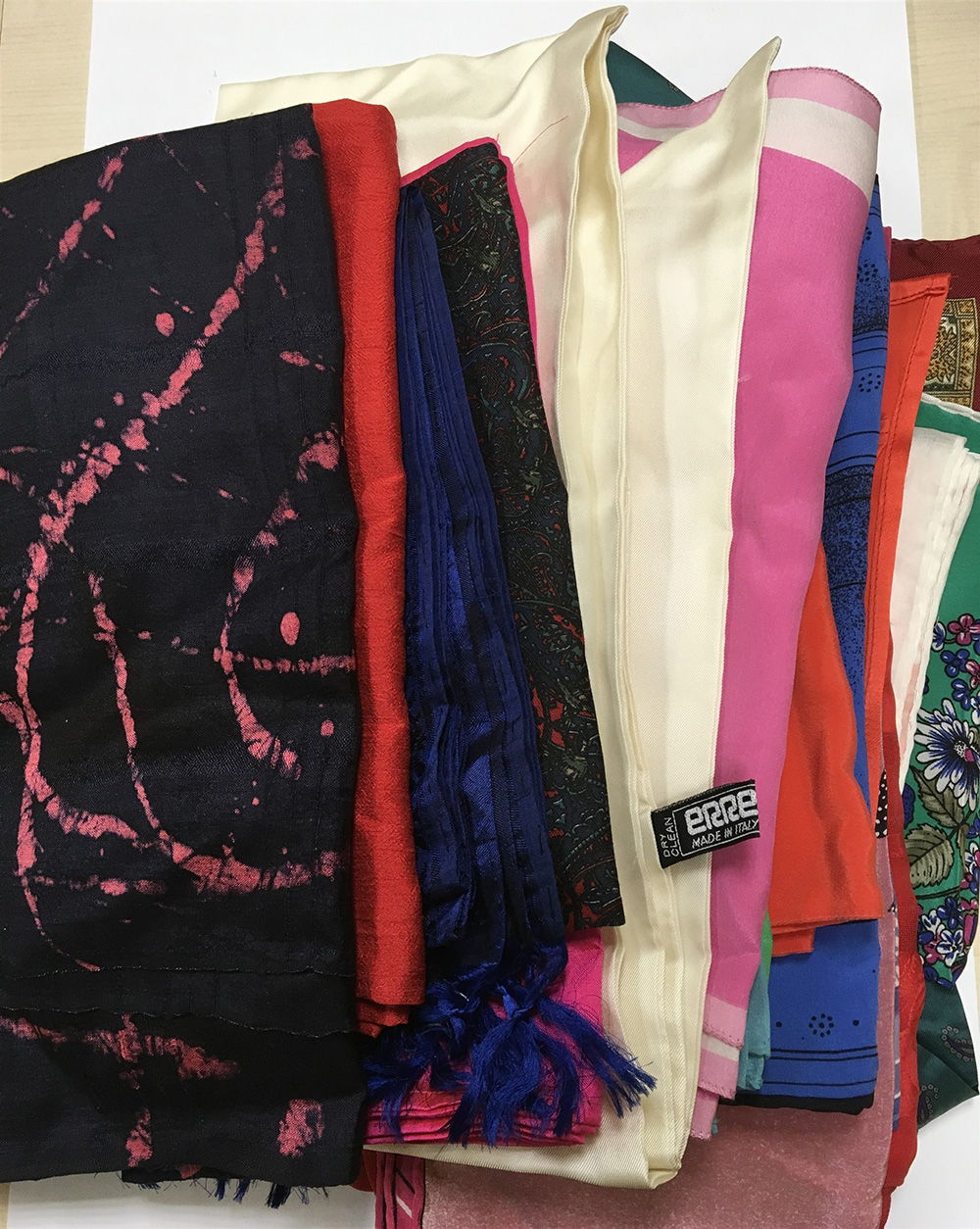 Lotto di circa tra 20 foulards, mini foulards e cache-col di misure, colori e materiali differenti (lievi difetti)