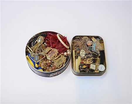 Lotto in due scatole composto da bigiotteria varia, due pezzi firmati Mila...