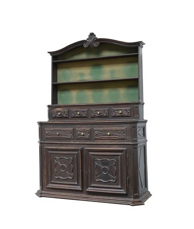 Dispensa con piattaia composta da una credenza a due sportelli e tre cassetti con cornici e decori geometrici intagliati, ed una alzata con quattro cassetti e tre ripiani per i piatti con cimasa mossa. Piemonte, secolo XIX (cm 161x246x57) (difetti e restauri)