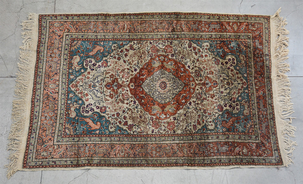 [Tappeti] Tappeto Kaisery, Anatolia, secolo XX. Annodato in cotone mercerizzato su ordito e trama in cotone. Disegno con animali a medaglione nei toni dell'arancio, blu, rosa su campo bianco. Angolari azzurri e bordura rosa (cm 177x122) (difetti)
