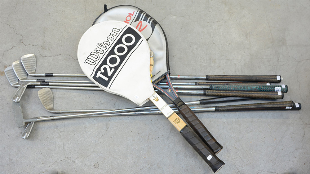 Lotto composto da due racchette da tennis e sette ferri da golf (difetti)
