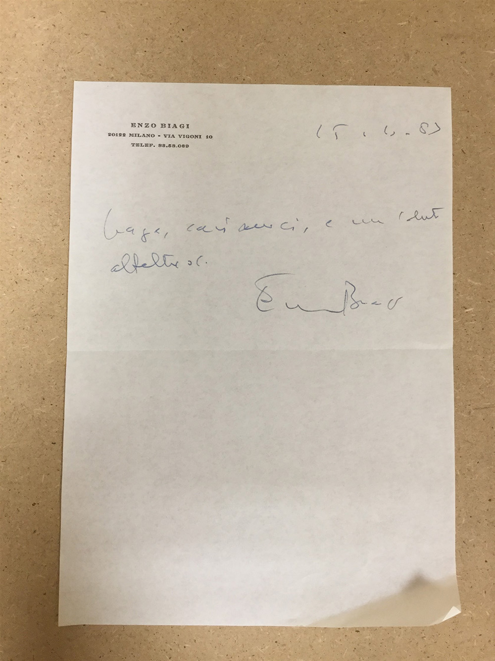 Breve nota autografa di Enzo Biagi (1920-2007), data 1987.