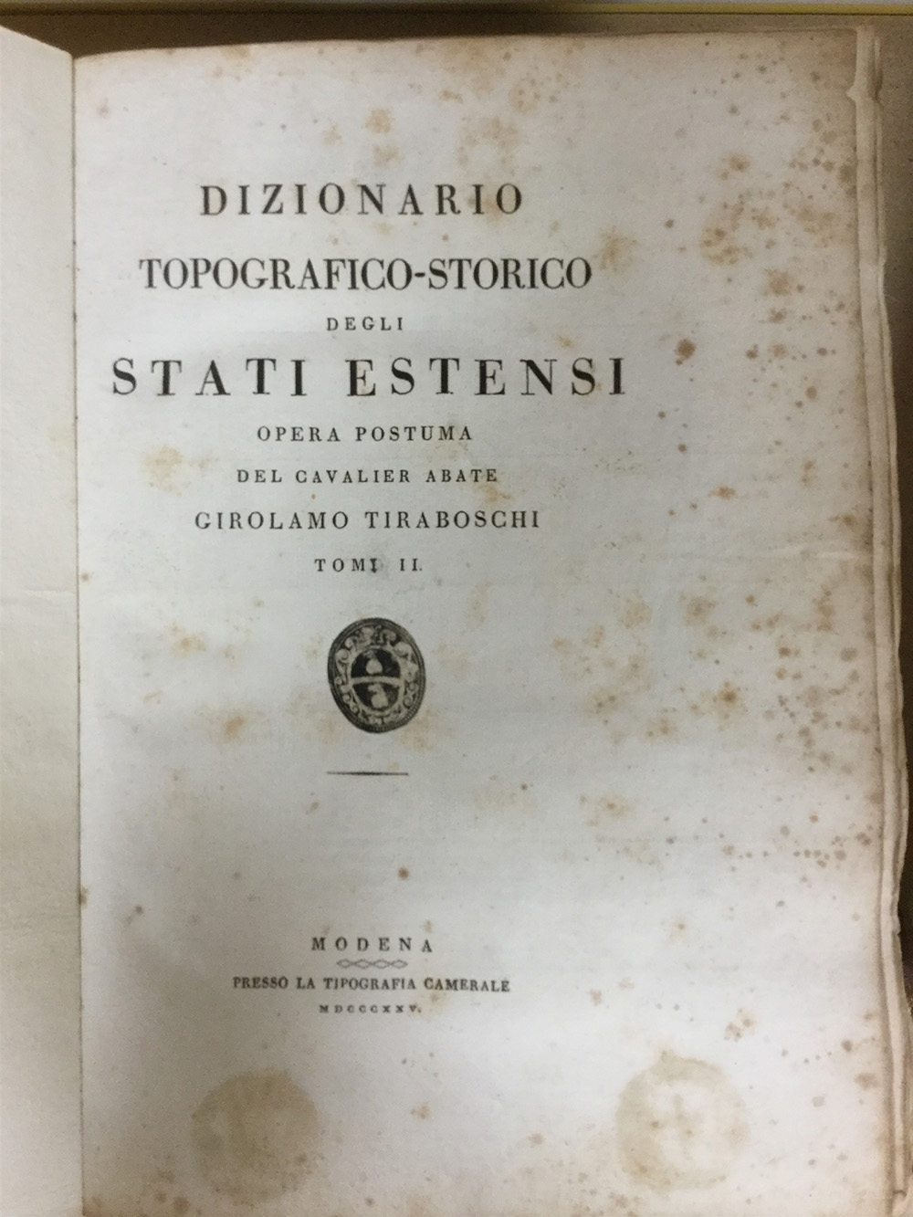 TIRABOSCHI, Girolamo (1731-1794). Dizionario topografico-storico degli Stati Estensi. Modena: Tipografia Camerale, 1825 (due tomi in uno). Vol. in 4to (fioriture). Legatura in piena pergamena coeva, taglio spruzzato azzurro.