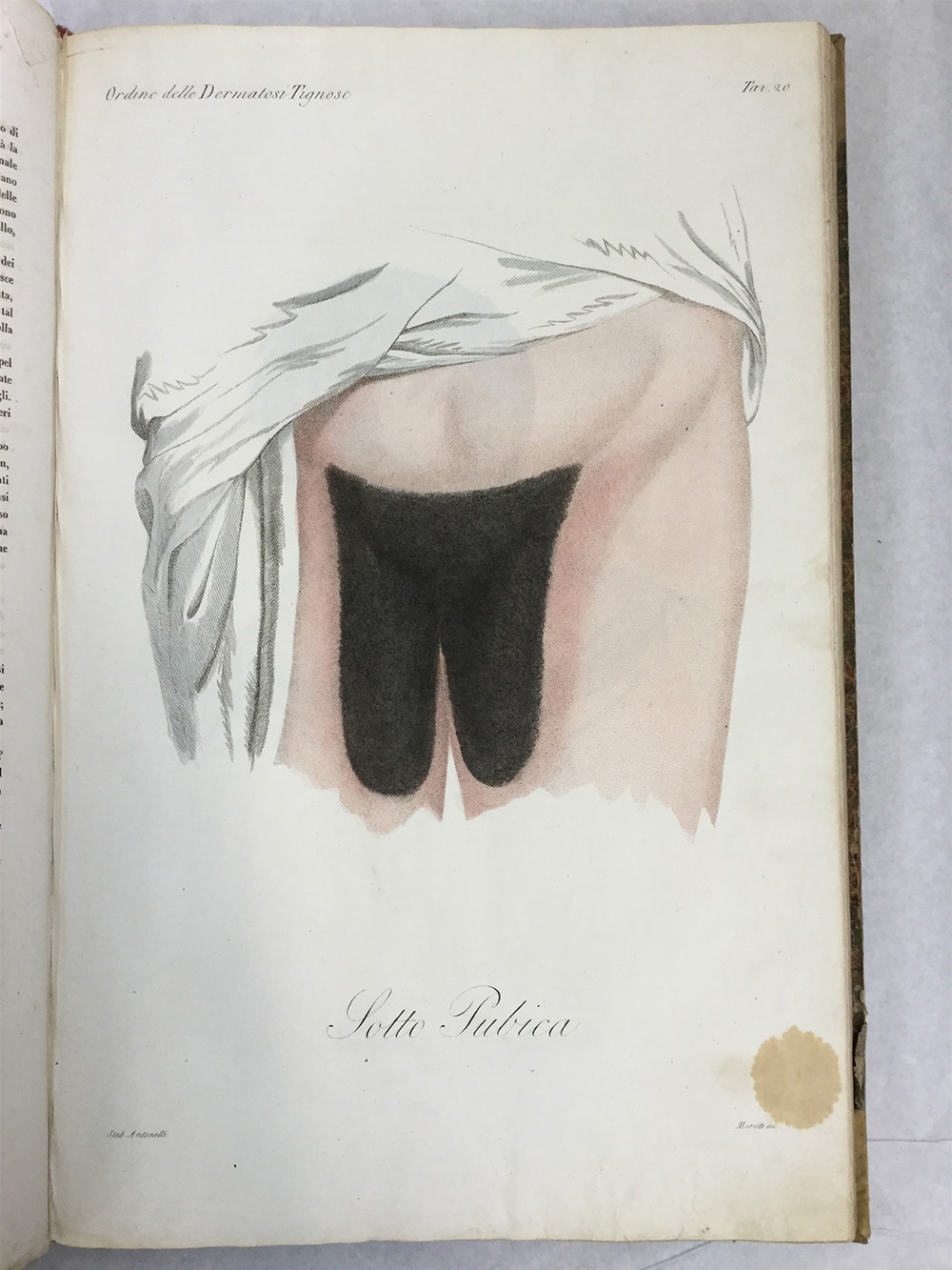 Alibert, Jean Louis (1768-1837). Clinica del parigino spedale di S. Luigi ossia Trattato compiuto delle malattie della pelle. Venezia: Giuseppe Antonelli, 1835. 65 (di 67) tavole (mancano la tavola 42 e 58). Legataura in mezza pergamena coeva. (Fioriture e lievi difetti).