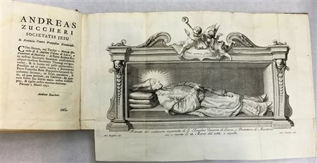 ROTA, Andrea (1687-1741). Notizie istoriche di s. Anselmo vescovo di Lucca, e protettore di Mantova raccolte dal p. Andrea Rota della Compagnia di Gesu coll'aggiunta di cose del santo inedite. Verona: Pierantonio Berno libraio nella via de' Lioni, 1733. Vol. in 8vo, con marca tipografica al frontespizio e ritratto del Santo (quest'ultimo stampato in rosso e nero). Legatura coeva in piena pergamena (dorso usurato).