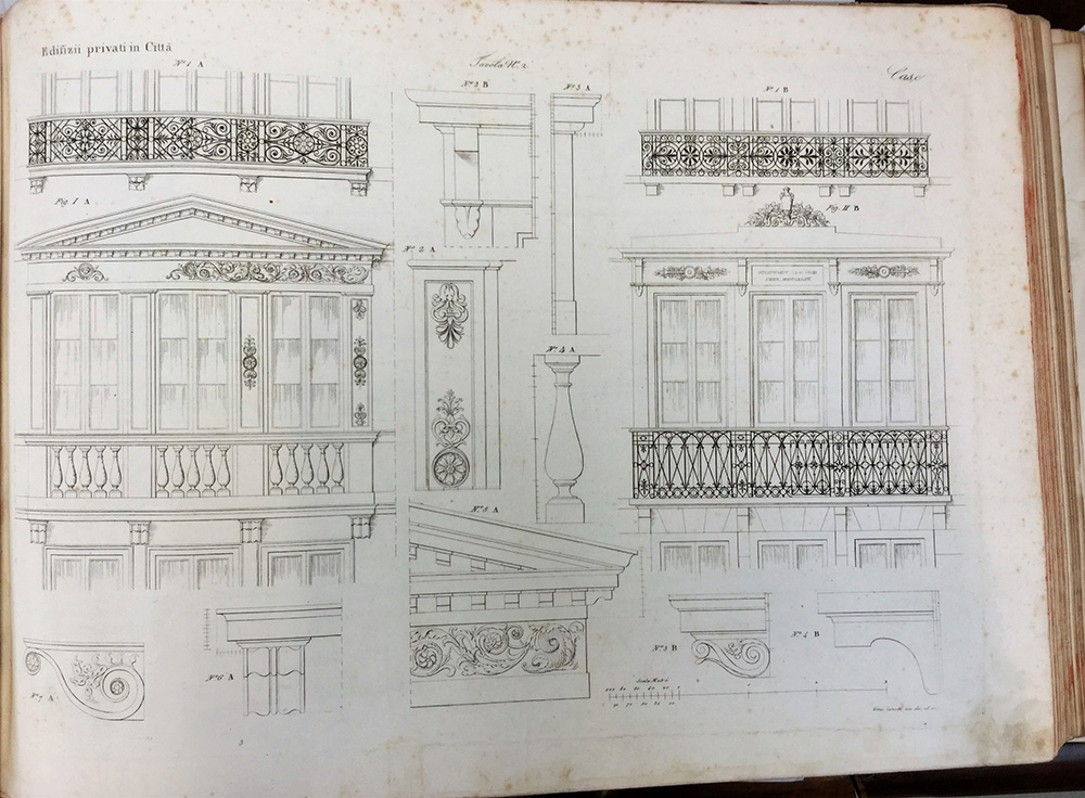 ZANETTI, Giuseppe. Studii architettonico-ornamentali. Venezia: Premiato Stabilimento G. Antonelli, 1843. Volume in 4to oblungo, con numerosissime tavole incise (fioriture, lievi bruniture, gore di umidità). Legatura coeva in piena pelle gravemente compromessa, taglio di colore rosso.