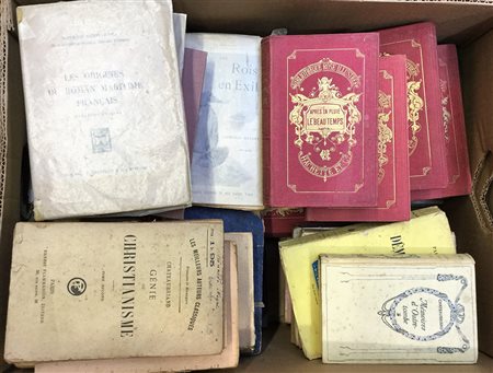 Lotto composto da numerosi romanzi della letteratura francese, fra cui alcuni volumi in legatura originale della collana "Bibliotheque Rose Illustré" decorate da pregevoli illustrazioni in bianco e nero; e l'opera MILTON. Le Paradis Perdue, traduction de Chateaubriand. Parigi: Amable Rigaud, 1863, ricco di incisioni dell'epoca; MUSSET, Alfred de. Poesies 1833-1852. Parigi: Alphonse Lamerre, con acuqeforti da Louis Menziés (lievi difetti). In cinque cartoni.
