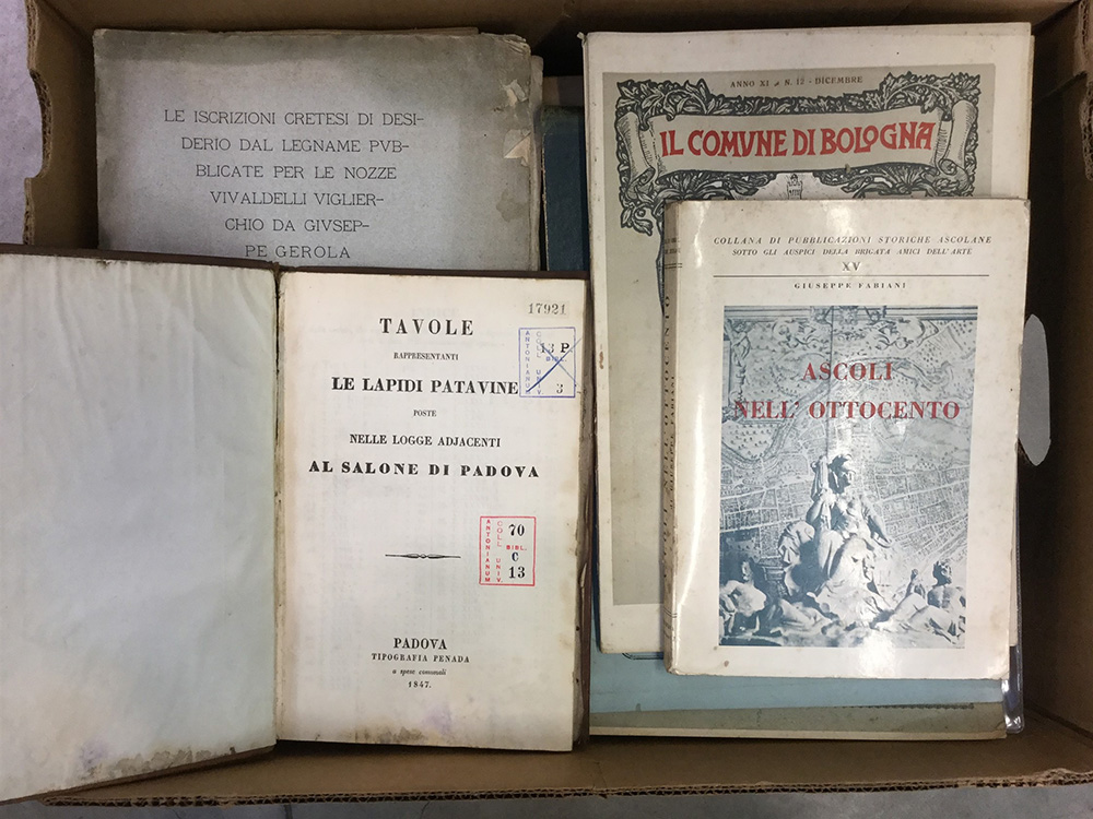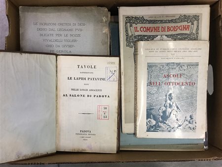 Lotto composto da numerosi volumi illustrati, inerenti le bellezze artistiche e naturali d’Italia, fra cui sono da menzionare: svariati volumi de "L'Ateneo Veneto" rivista bimestrale di Scienze, lettere e arti (1909-1911), una monografia sull'arte della città di Pisa ricca di disegni e illustrazioni; una pubblicazione sulle lapidi patavine (Padova: Tipografia Penada, 1847) e due carte topografiche su tessuto dell'Altipiano d'Asiago. In quattro cartoni.