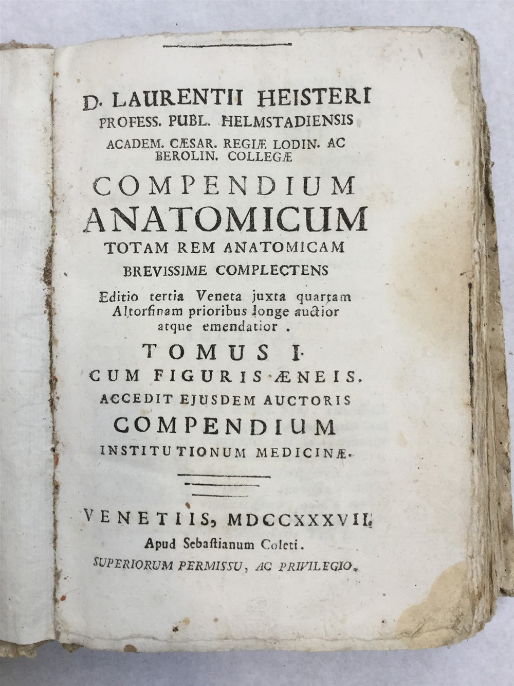 HEISTER, Lorenz. Compendium Anatomicum. Venezia: Sebastiano Coleti, 1787 (primo tomo). Vol. in 8vo, con 8 tavole incise alla fine (manca la tav. V). Legatura coeva cartonata (lievi difetti).