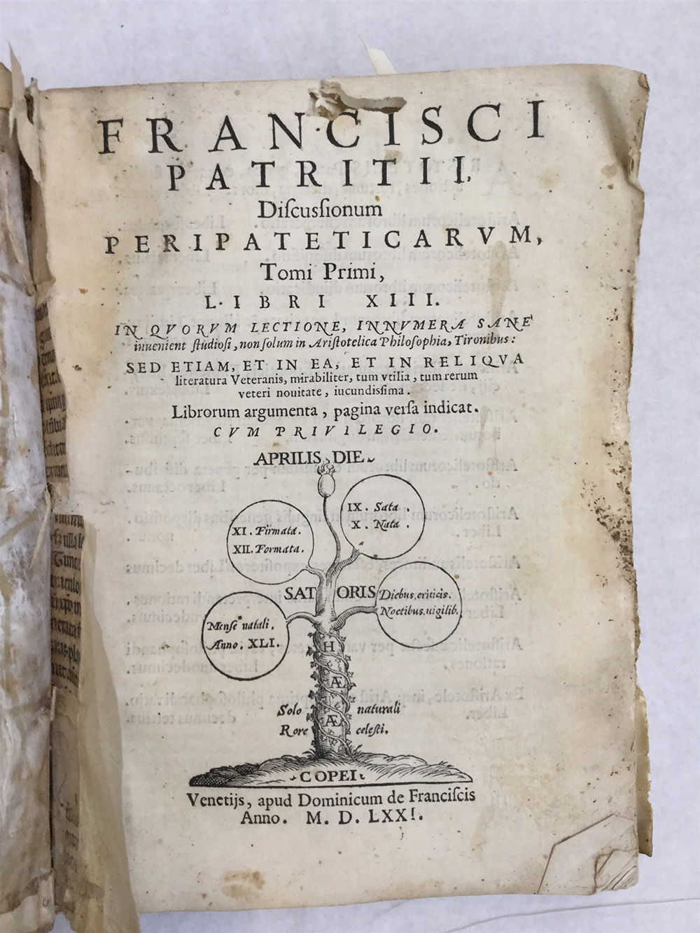 PATRIZI, Francesco. Francisci Patritij, Discussionum peripateticarum...Libri XIII. Venezia: Domenico de Franceschi, 1571. Vol. in 4to, con vignetta xilografata al frontespizio, iniziali xilografate e parti del testo in greco (gore di umidità e diffuse tracce di tarli). Legatura di riuso (tracce di scrittura gotica) in piena pergamena coeva, con nervatura a vista (molto rovinata).