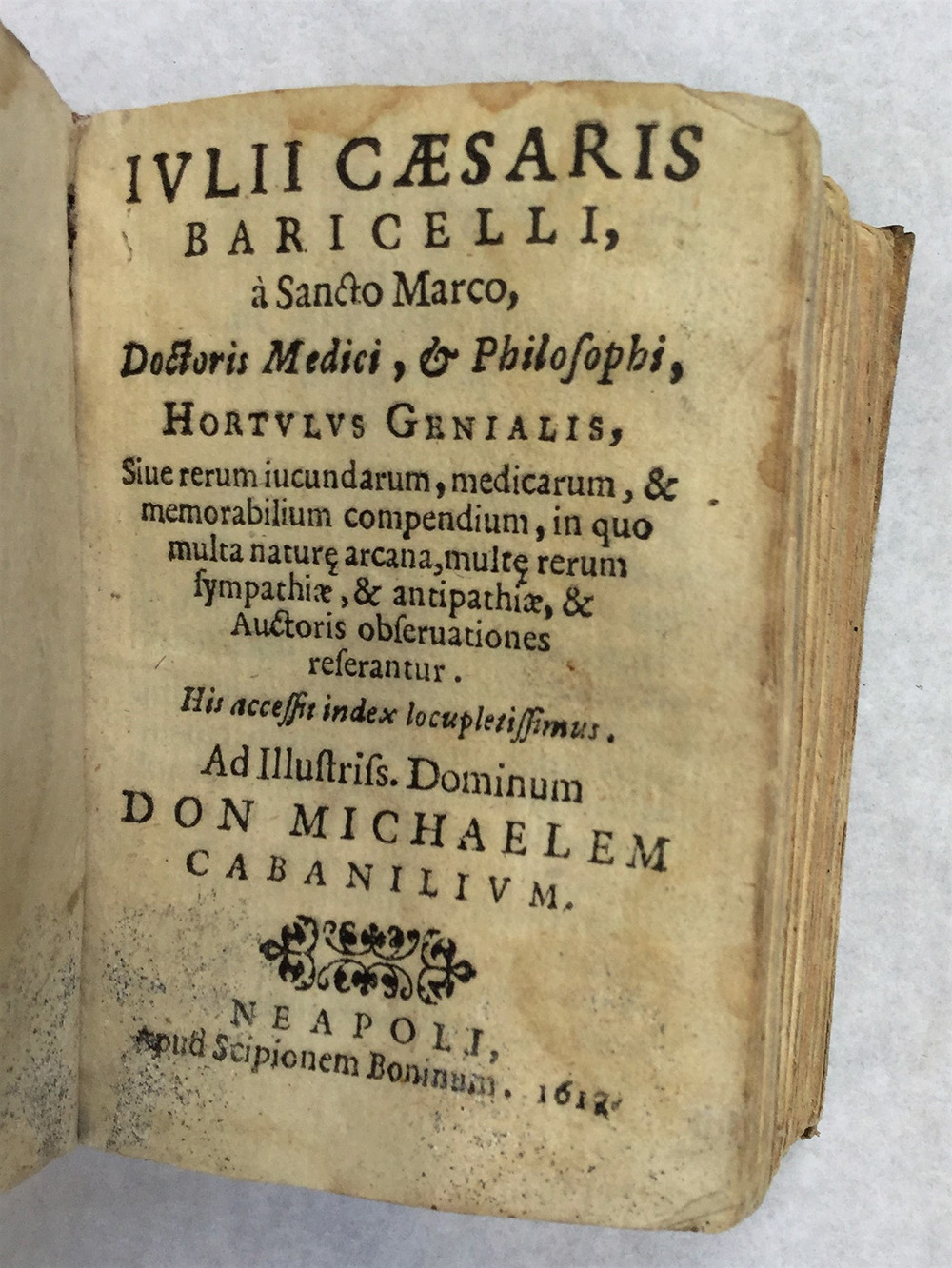 BARICELLI, Giulio Cesare. Hortulus Genialis. Napoli: Scipione Bonino, 1617. Vol. in 16mo (bruniture, tracce di tarli e gore di umidità). Legatura coeva in piena pergamena (lievi difetti).