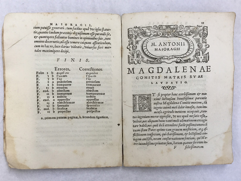 MAJORAGIO, Marco Antonio. Luti encomium et Magdalenae comitis matris suae mortuae laudatio. Milano: Francesco Moscheni, 1566. Vol. in 4to, con bella marca tipografica al frontspizio, iniziali e fregi xilografati ()bruniture e gore di umidità). Legatura cartonata coeva (piatti e dorso compromessi).