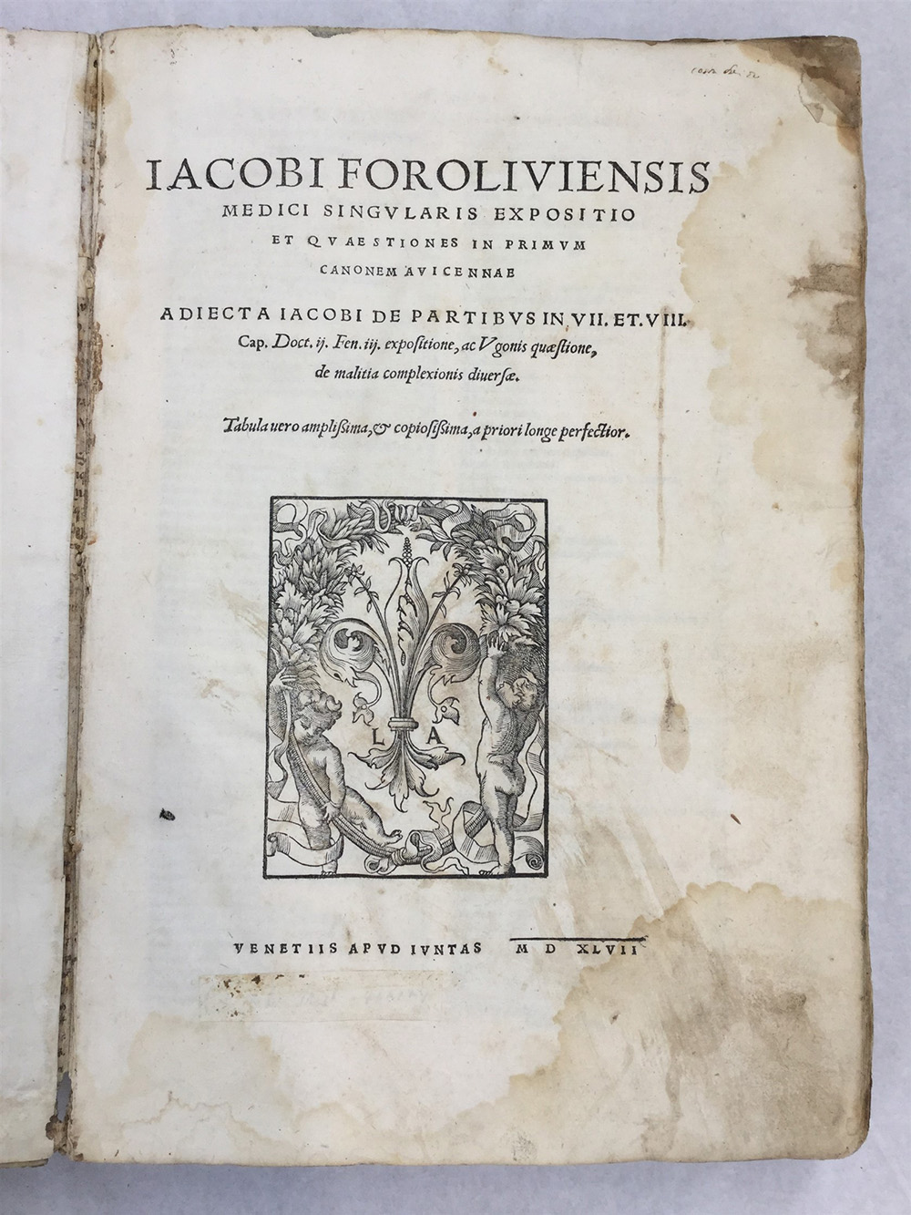 DELLA TORRE, Giacomo. Singularis expositio et quaestiones in primum canonem Avicennae. Venezia: Giunta, 1547. Vol. in folio, con marca tipografica al frontespizio (gore di umidità e fioriture). Legatura in piena pergamena coeva, taglio azzurro lievemente scolorito (dorso lievemente usurato in prossimità delle nervature, piatti segnati dall'umidità).