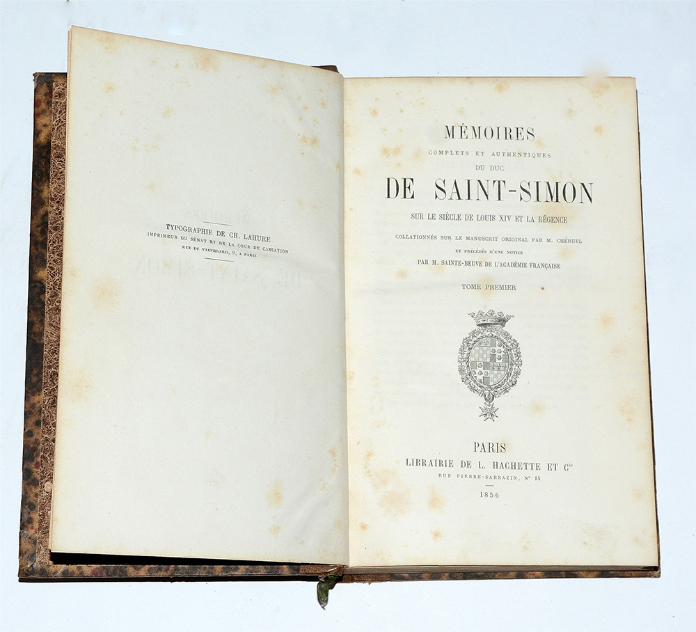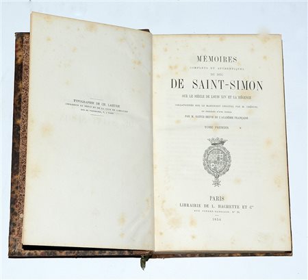 Mémoires complets et authentiques du duc de Saint-Simon... Parigi: Librairie Hachette, 1856-1858. 20 volumi rilegati in mezza pelle con piatti marmorizzati. L'ultimo volume presenta la riproduzione del testamento olografo di Saint-Simon.