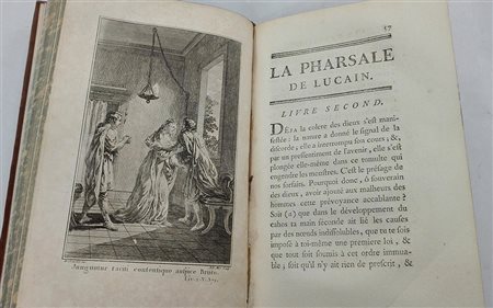 La Pharsale de Lucain. Parigi: Merlin, 1766. 2 volumi in 8vo, con incisione al frontespizio nel primo volume e tavole fuori testo. Legatura in piena pelle con titolo e autore al dorso (lievi difetti).